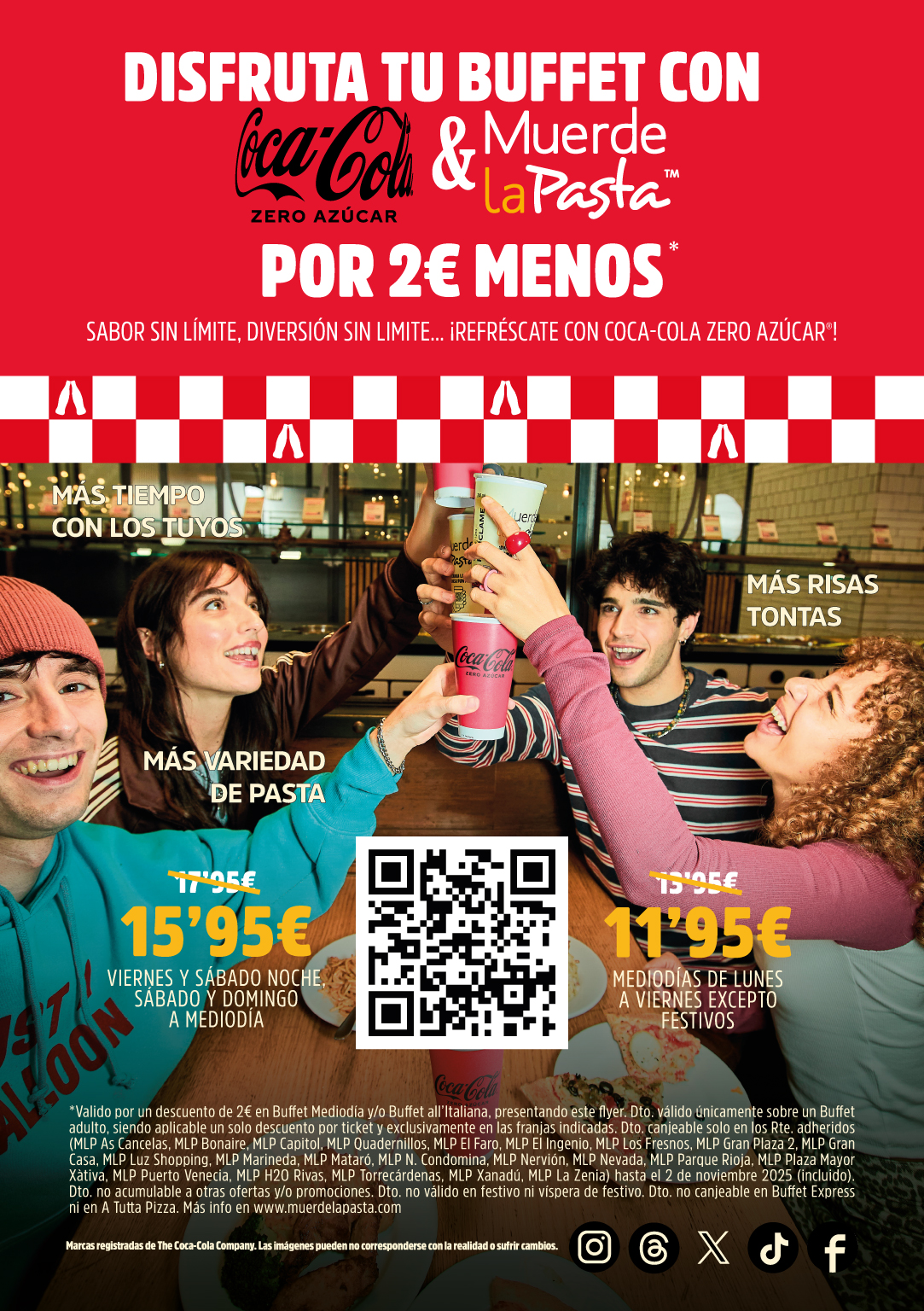 La presente promoción tiene por objeto ofrecer a los clientes de Muerde la Pasta un descuento de 2€ sobre el precio de Buffet Mediodía y/o Buffet all’Italiana en los restaurantes adheridos, presentando el flyer promocional en el momento del pago.